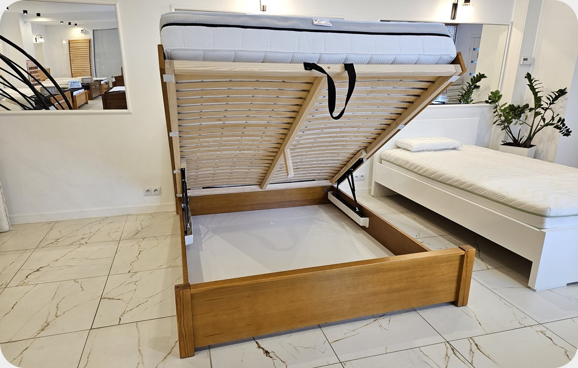 Pojemnik posadowiony jest na podłodze co zwiększa wytrzymałość konstrukcji łóżka i jednocześnie sprawia, że będzie trwały nawet po umieszczeniu w nim wielu przedmiotów. Otwieranie od przodu - wzdłuż szerokości łóżka za pomocą mechanizmów gazowych.