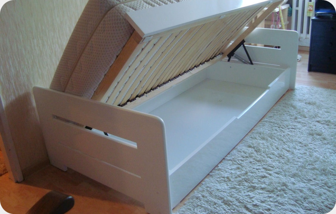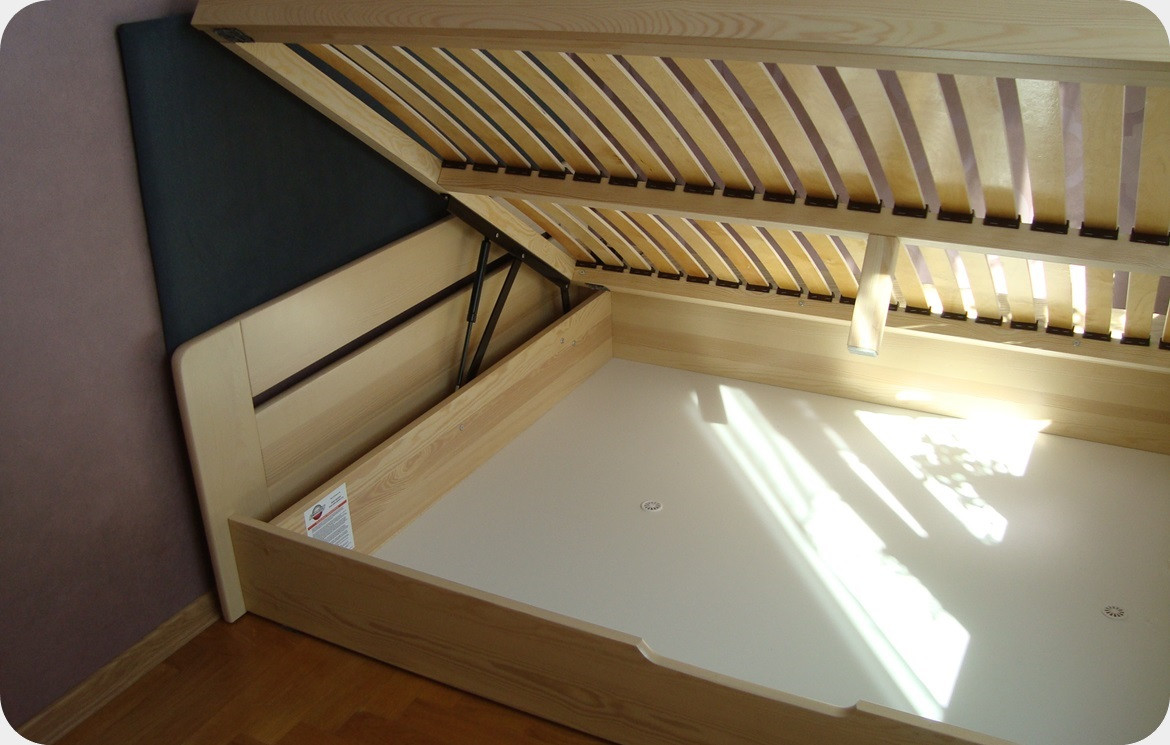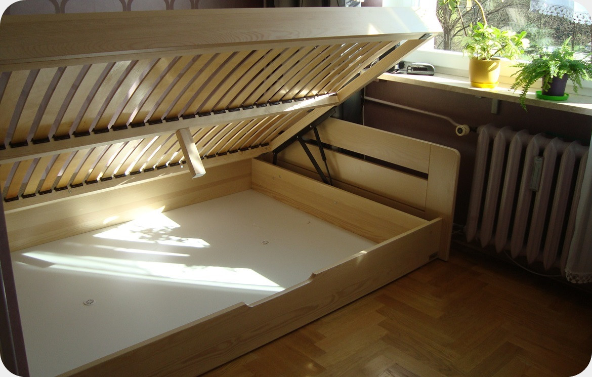 Pojemnik posadowiony jest na podłodze co zwiększa wytrzymałość konstrukcji łóżka i jednocześnie sprawia, że będzie trwały nawet po umieszczeniu w nim wielu przedmiotów. Łóżko do wymiaru 120x200 posiada otwieranie boczne na siłownikach sprężynowych. Od wymiaru 140x200 występuje otwieranie od przodu - wzdłuż szerokości łóżka za pomocą mechanizmów gazowych. Możliwość zamówienia otwierania bocznego.