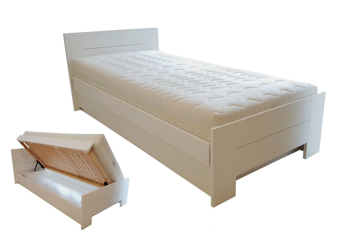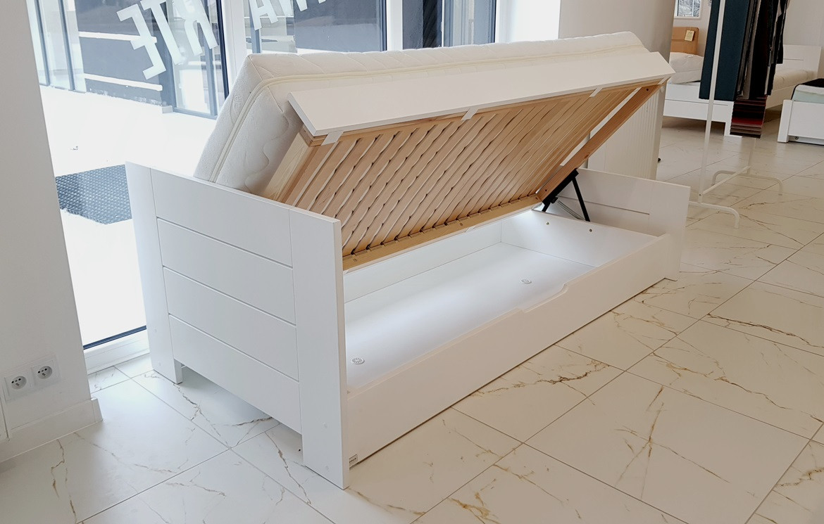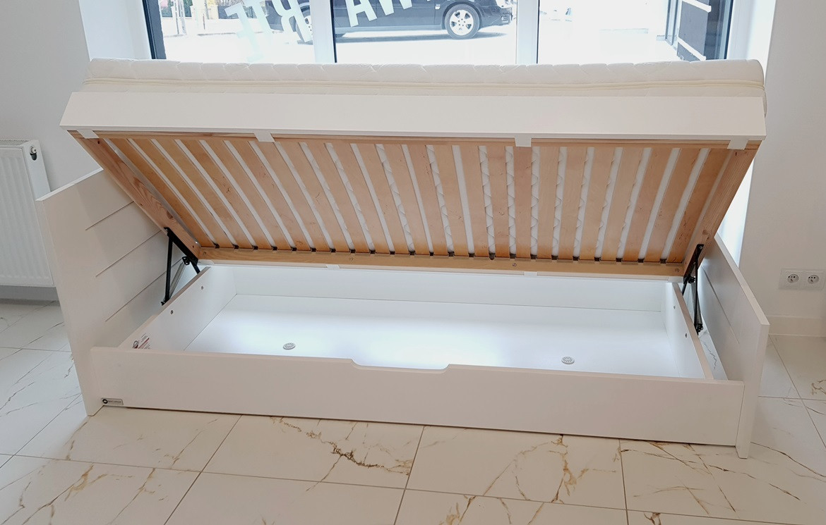 Pojemnik podbity jest ślizgami meblowymi i posadowiony na podłodze co zwiększa wytrzymałość konstrukcji łóżka i jednocześnie sprawia, że będzie trwały nawet po umieszczeniu w nim wielu przedmiotów. Łóżko posiada otwieranie od doku - wzdłuż długości łóżka za pomocą mechanizmów sprężynowych.