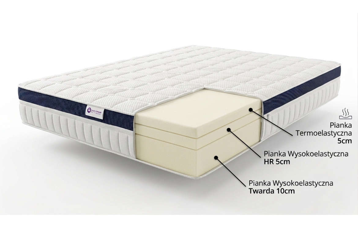 Dream Termo to materac zbudowany z pianki Kaltshaum o grubości 10 cm i gęstości 50kg/m³, wysokoelastycznej 5cm o gęstości 40kg/m3 oraz pianki termoelastycznej o grubości 5cm i gęstości 70kg/m³. Pokrowiec zdejmowalny, pikowany włóknem klimatyzującym. Pianka wysokoelastyczna posiada wiele istotnych walorów- jest bardzo wytrzymała, odporna na obciążenia oraz stanowi dobre oparcie dla pianki termoelastycznej. Zewnętrzna pianka termoelastyczna wykazuje właściwości redukujące napięcie mięśniowe dzięki idealnemu odwzorowaniu kształtu ciała. Pianka podpiera ciało, ale nie napiera na nie co sprawia, że kręgosłup jest idealnie podparty, a mięśnie go utrzymujące odpoczywają. Takie działanie pianki powoduje, że sen staje się maksymalnie komfortowy. Pianka termoelastyczna dopasowuje się przede wszystkim pod wpływem temperatury ciała dzięki czemu nie blokuje swobodnego przepływu krwi, dlatego polecana jest również osobom z problemami krążenia krwi. Materac Dream Termo będzie idealny dla osób, które cierpią na drętwienie kończyn spowodowane uciskami podczas snu. Materac posiada dodatkowy pokrowiec wewnętrzny, zapewniający lepszą ochronę wkładu materaca. Materac służy do użytku jednostronnego.
