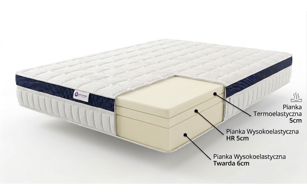 Dream Termo to materac zbudowany z pianki Kaltshaum o grubości 6 cm i gęstości 50kg/m³, wysokoelastycznej 5cm o gęstości 40kg/m3 oraz pianki termoelastycznej o grubości 5cm i gęstości 70kg/m³. Pokrowiec zdejmowalny, pikowany włóknem klimatyzującym. Pianka wysokoelastyczna posiada wiele istotnych walorów- jest bardzo wytrzymała, odporna na obciążenia oraz stanowi dobre oparcie dla pianki termoelastycznej. Zewnętrzna pianka termoelastyczna wykazuje właściwości redukujące napięcie mięśniowe dzięki idealnemu odwzorowaniu kształtu ciała. Pianka podpiera ciało, ale nie napiera na nie co sprawia, że kręgosłup jest idealnie podparty, a mięśnie go utrzymujące odpoczywają. Takie działanie pianki powoduje, że sen staje się maksymalnie komfortowy. Pianka termoelastyczna dopasowuje się przede wszystkim pod wpływem temperatury ciała dzięki czemu nie blokuje swobodnego przepływu krwi, dlatego polecana jest również osobom z problemami krążenia krwi. Materac Dream Termo będzie idealny dla osób, które cierpią na drętwienie kończyn spowodowane uciskami podczas snu. Materac posiada dodatkowy pokrowiec wewnętrzny, zapewniający lepszą ochronę wkładu materaca. Materac służy do użytku jednostronnego.