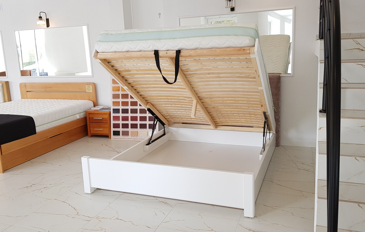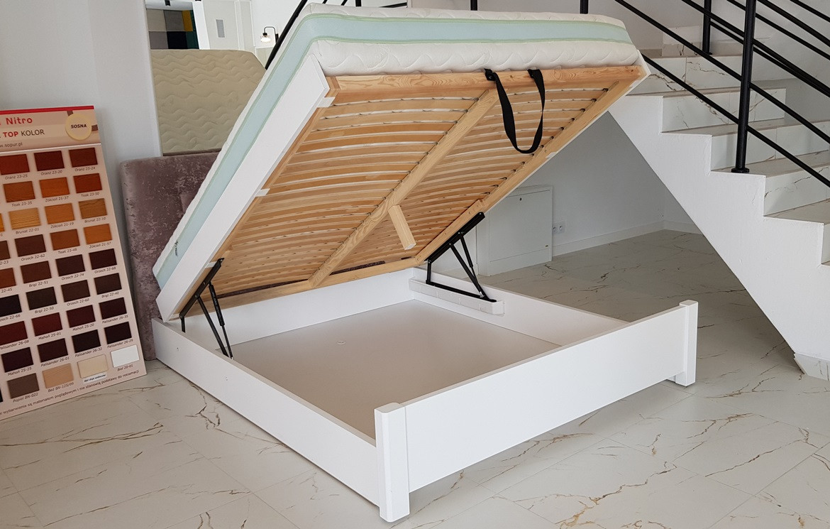 Pojemnik posadowiony jest na podłodze co zwiększa wytrzymałość konstrukcji łóżka i jednocześnie sprawia, że będzie trwały nawet po umieszczeniu w nim wielu rzeczy. Łóżko posiada otwieranie od przodu - wzdłuż szerokości łóżka za pomocą mechanizmów gazowych.